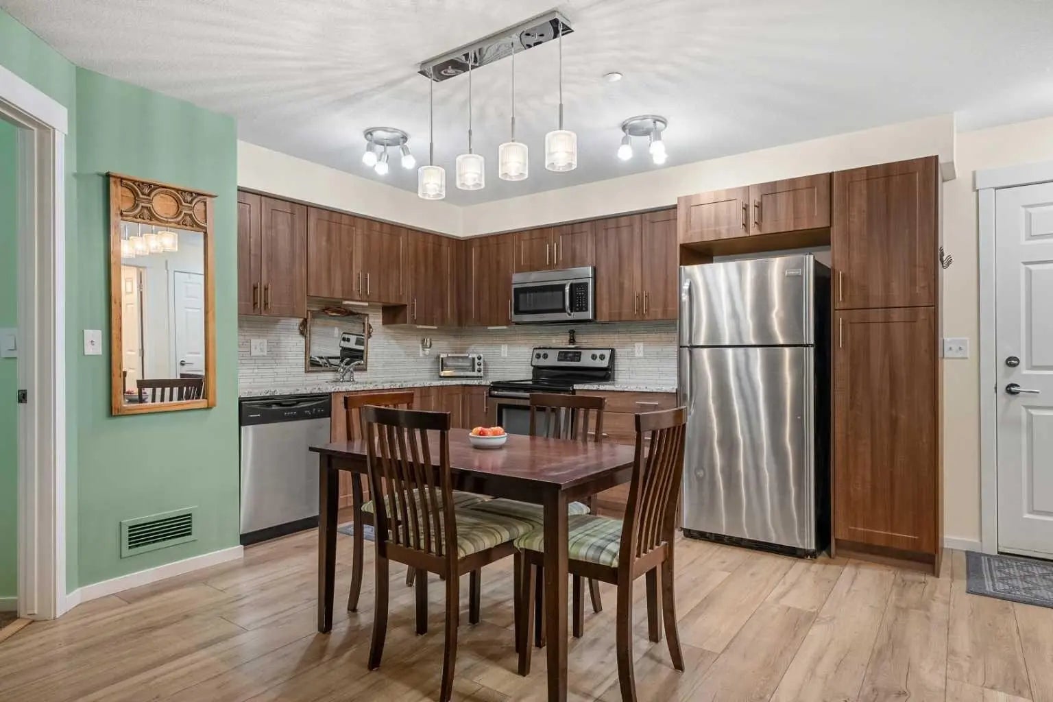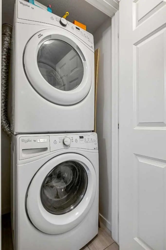 Dishwasher, Electric Stove, Microwave Hood Fan, Refrigerator, Washer/Dryer Stacked